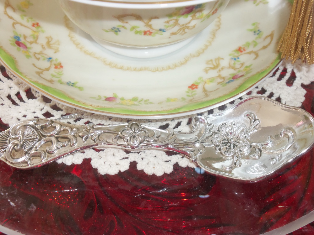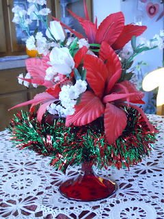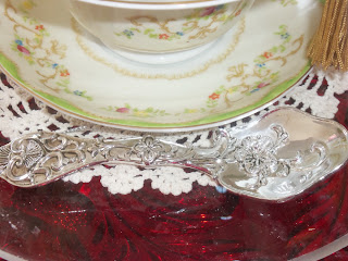 The cute silver spoon is a Christmas tree ornament that I thought would go quite well in this display. It does look rather rich with the tea cups so I'm pleased. The cake plate I am using I won from a raffle last year. I love it as it goes so well with the big collection of ruby flash Early American Pressed Glass items I have.